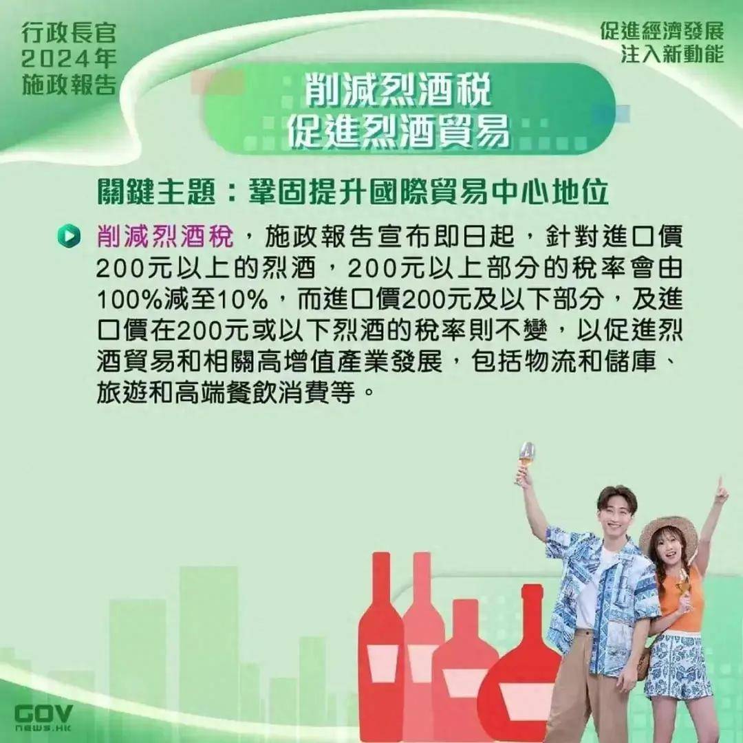 个人认为香港烈酒税的大幅下调是一个积极的举措,虽然短期内可能面临一些困难和问题,如健康和社会问题,但长远来看,这将促进香港酒类市场的发展,为相关产业带来更多的发展机遇,政府可以通过有效的政策调整和管理,克服可能出现的困难,实现社会的繁荣和进步,公众也应积极配合,合理饮酒,共同维护社会的健康和稳定。